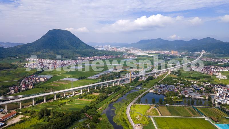 图片说明:2023年9月7日,俯瞰浙江省金华市杭温高铁东阳段横店特大桥矮塔斜拉桥完成张拉,与绿色田园构成一幅美丽景象(无人机照片)。