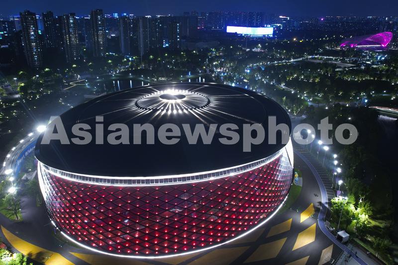 图片说明:2023年9月6日晚,俯瞰杭州亚运会竞赛场馆——拱墅运河体育公园体育馆。
