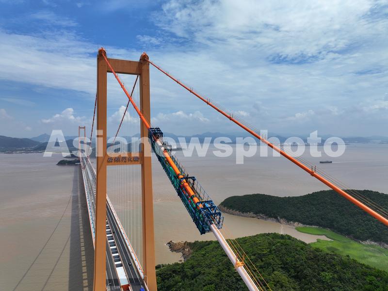 2023年9月6日,在浙江省舟山跨海大桥之一的西堠门大桥Á岛侧主缆上,工人们施工平台上为大桥主缆进行缠包作业。两条佛光黄的主缆更显大桥壮观。