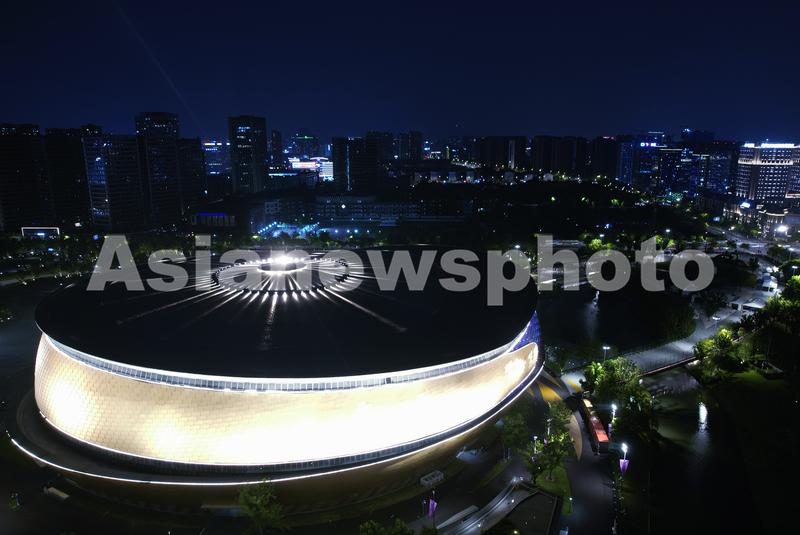 图片说明:2023年9月6日晚,俯瞰杭州亚运会竞赛场馆——拱墅运河体育公园体育馆。