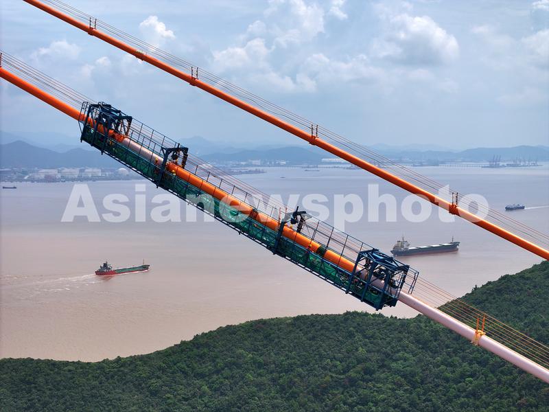 2023年9月6日,在浙江省舟山跨海大桥之一的西堠门大桥Á岛侧主缆上,工人们施工平台上为大桥主缆进行缠包作业。两条佛光黄的主缆更显大桥壮观。