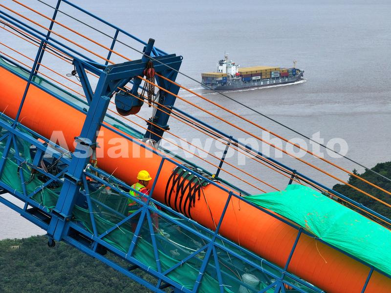 2023年9月6日,在浙江省舟山跨海大桥之一的西堠门大桥Á岛侧主缆上,工人们施工平台上为大桥主缆进行缠包作业。两条佛光黄的主缆更显大桥壮观。