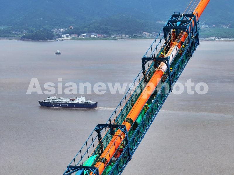 2023年9月6日,在浙江省舟山跨海大桥之一的西堠门大桥Á岛侧主缆上,工人们施工平台上为大桥主缆进行缠包作业。两条佛光黄的主缆更显大桥壮观。