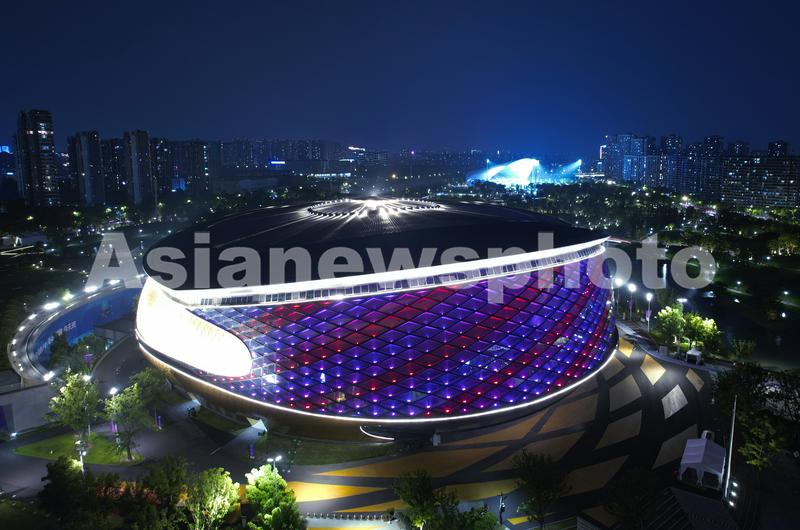图片说明:2023年9月6日晚,俯瞰杭州亚运会竞赛场馆——拱墅运河体育公园体育馆。