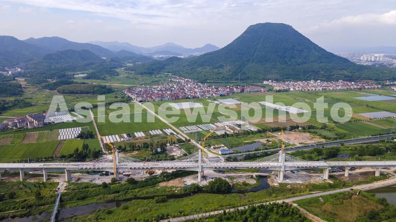 图片说明:2023年9月7日,俯瞰浙江省金华市杭温高铁东阳段横店特大桥矮塔斜拉桥完成张拉,与绿色田园构成一幅美丽景象(无人机照片)。