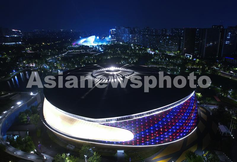 图片说明:2023年9月6日晚,俯瞰杭州亚运会竞赛场馆——拱墅运河体育公园体育馆。