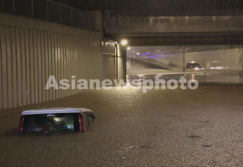 9月8日凌晨,香港新界大埔区,车辆困在洪水中。中国日报记者 邓永安 摄