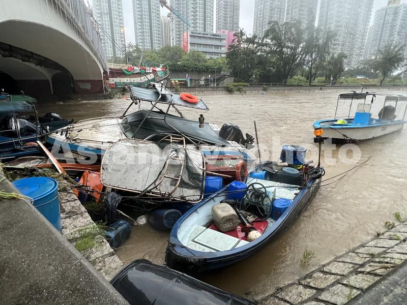 9月8日,香港新界大埔区,停泊在林村河上的船只受到不同程度的损坏。中国日报记者 邓永安 摄