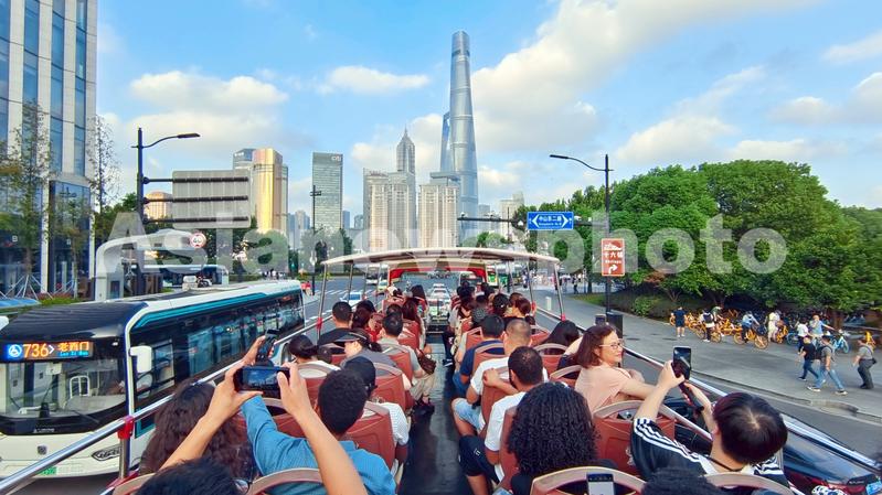 图片说明:2023年9月7日,上海,中外游客乘坐都市旅游观光巴士双层敞篷车经过外滩十六铺码头,通过类似VR游戏视角欣赏上海中心大厦等陆家嘴金融贸易开发区高楼风景。