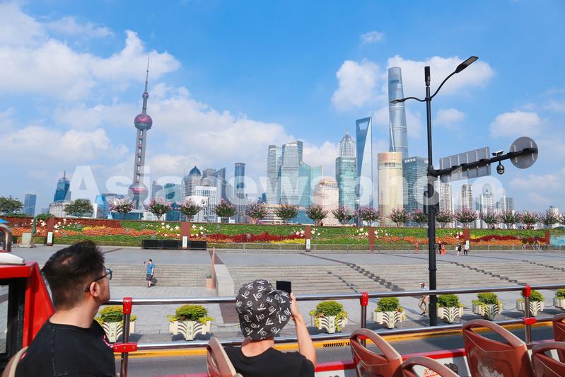 图片说明:2023年9月7日,上海,游客在外滩乘坐都市旅游观光巴士双层敞篷车,欣赏黄浦江对岸东方明珠和陆家嘴金融贸易开发区高楼风景。