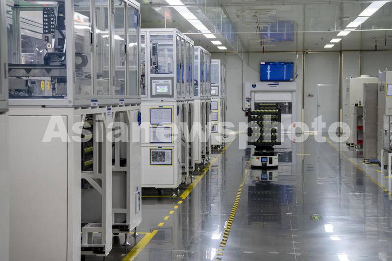 图片说明:2023年9月7日,浙江省东阳市横店镇东磁高新产业园区锂电池自动化生产车间里,智能搬运小车在生产车间里搬运材料。