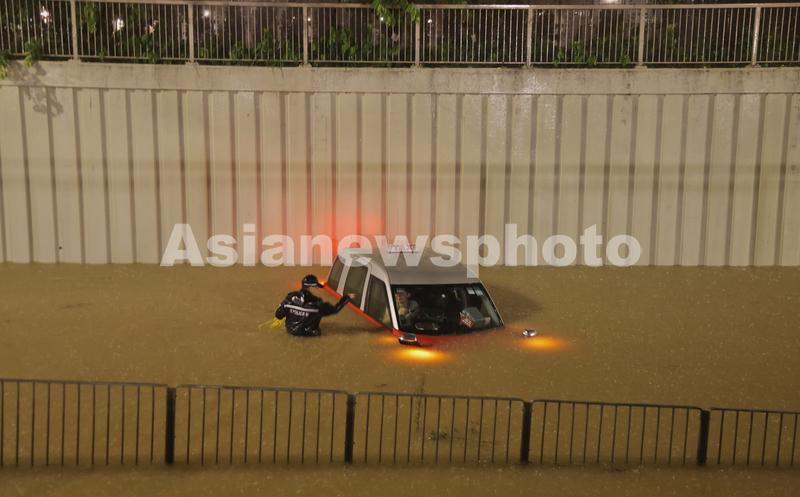 9月8日凌晨,香港新界大埔区,警察对困在洪水中的出租车司机进行救援。中国日报记者 邓永安 摄