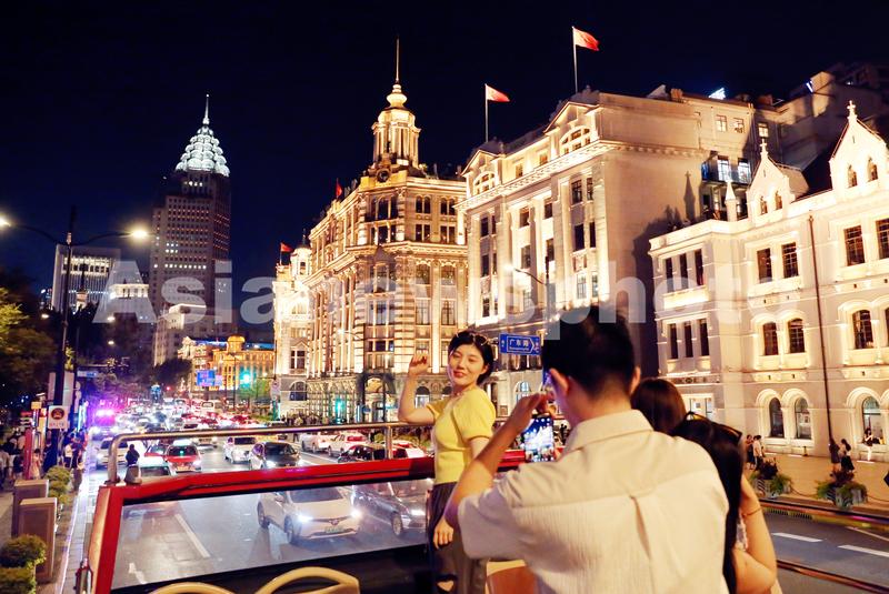 图片说明:2023年9月7日,上海,中外游客乘坐都市旅游观光巴士双层敞篷车欣赏夜上海,拍摄外滩海关大楼等万国建筑群魔都夜景。