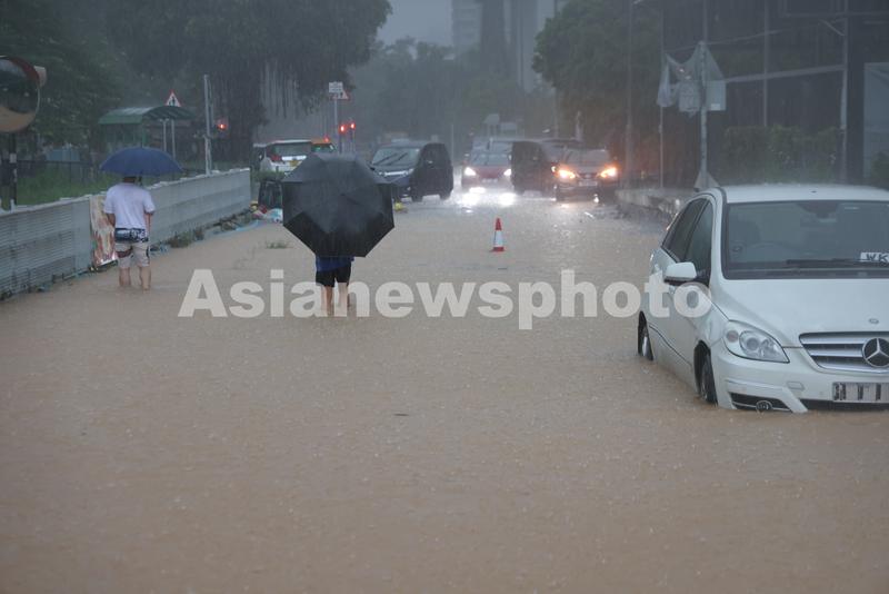 9月8日,香港新界大埔区,行人涉水出行。中国日报记者 邓永安 摄