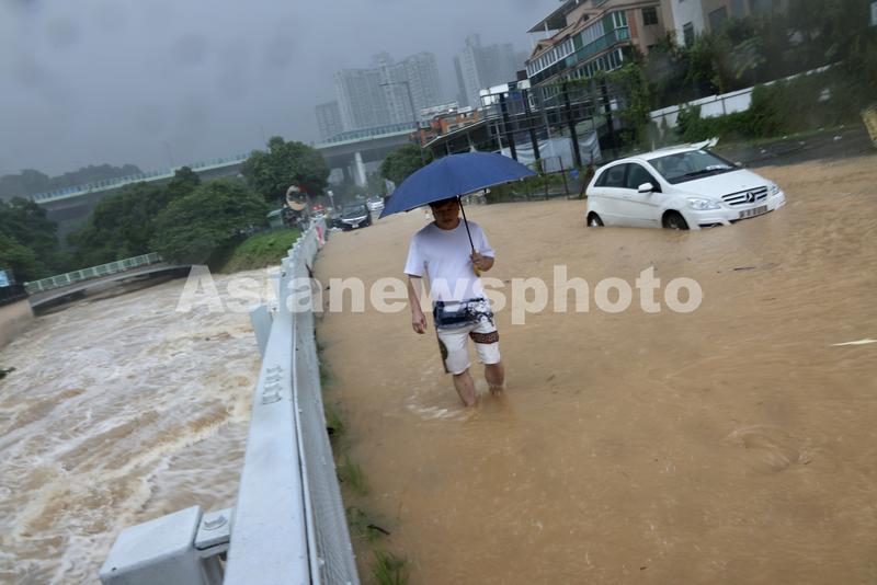 9月8日,香港新界大埔区,行人涉水出行。中国日报记者 邓永安 摄