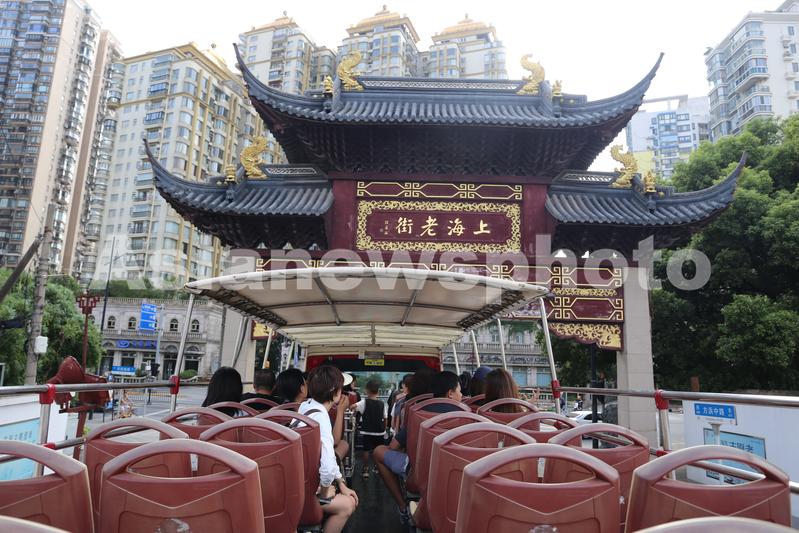 图片说明:2023年9月7日,上海,游客乘坐都市旅游观光巴士双层敞篷车经过申城地标建筑——豫园老街牌楼。