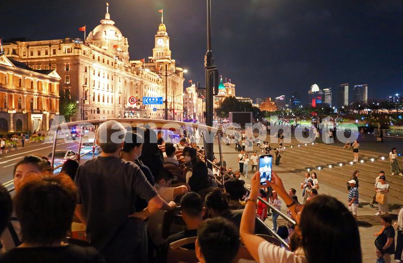 图片说明:2023年9月7日,上海,中外游客乘坐都市旅游观光巴士双层敞篷车欣赏夜上海,拍摄外滩海关大楼等万国建筑群魔都夜景。