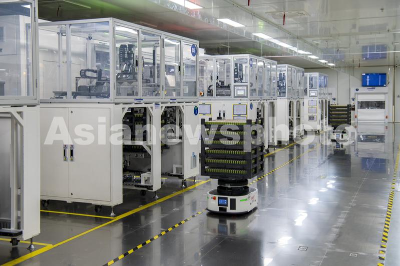 图片说明:2023年9月7日,浙江省东阳市横店镇东磁高新产业园区锂电池自动化生产车间里,智能搬运小车在生产车间里搬运材料。