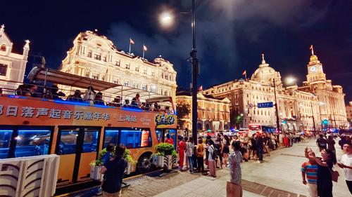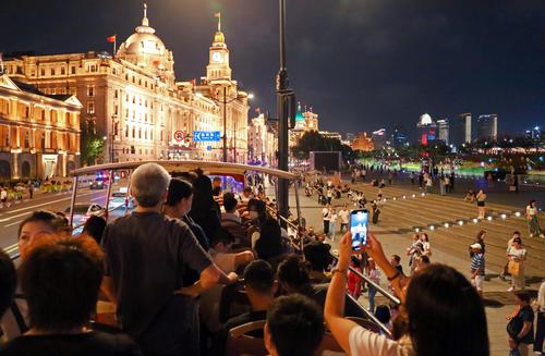 图片说明:2023年9月7日,上海,中外游客乘坐都市旅游观光巴士双层敞篷车遨游魔都外滩,欣赏夜上海万国建筑群夜景。