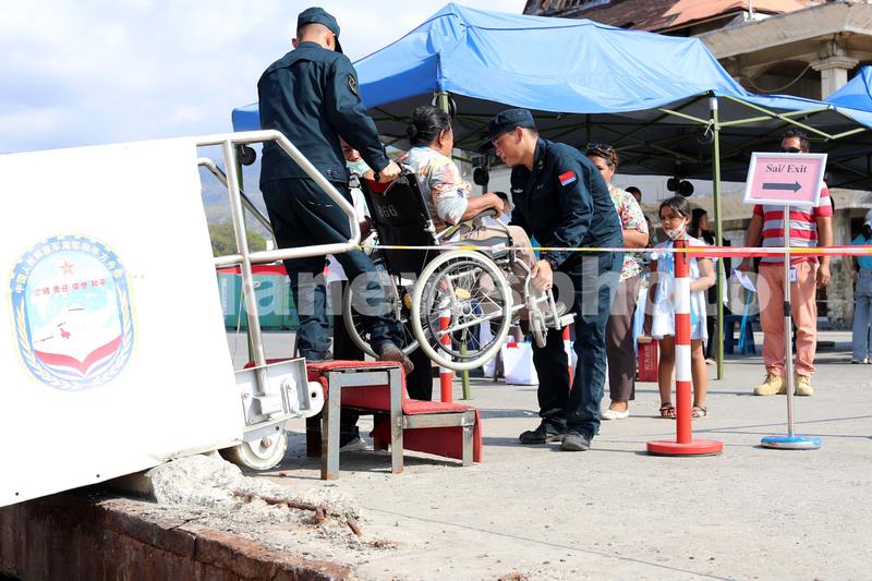 图片说明:”和平方舟“号医院船官兵为东帝汶行动不便患者服务-桂江波 摄