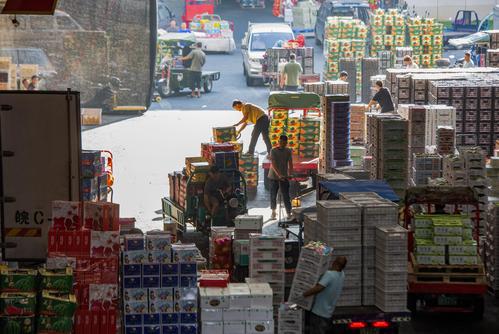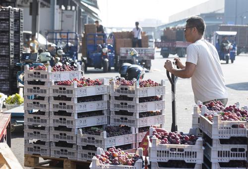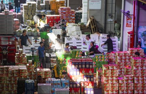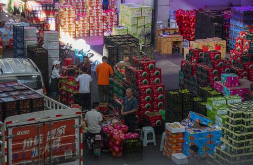 2023年9月11日,在浙江省金华市水果批发市场,各种国产和进口水果摆满了经营户商铺,进货、卸货的人员和车辆一片忙碌景象,水果迎来了一年中的销售旺季。