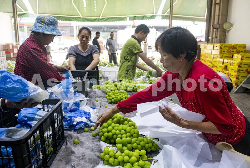 2023年9月11日,在浙江省金华市水果批发市场,经营户组织人员分装葡萄。