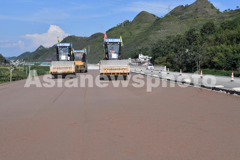 图片说明:2023年9月10日,贵州省公路集团的施工人员在六安高速公路第4标段驾驶压路机对水泥稳定碎石基层碾压。