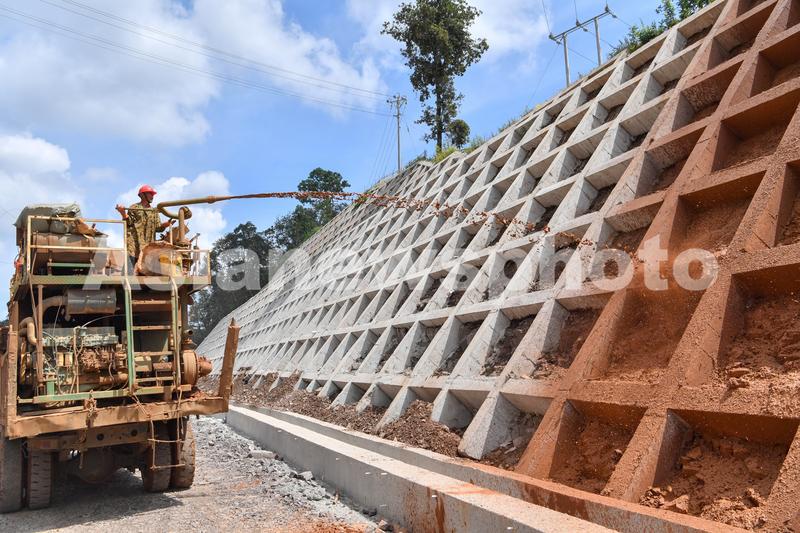 图片说明:2023年9月11日,贵州省公路集团的施工人员在六安高速公路第14标段工程建设项目现场喷水泥砂桨。