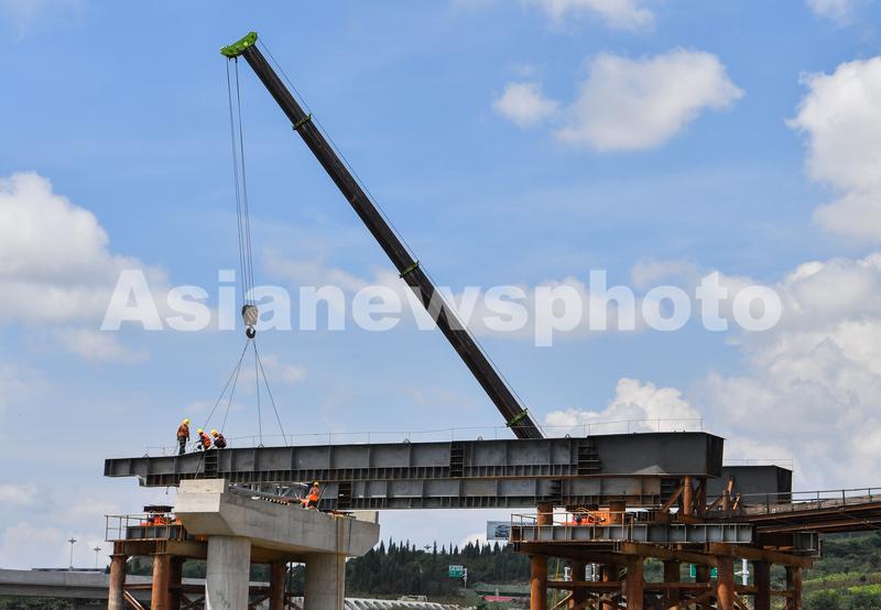 图片说明:2023年9月11日,贵州省公路集团的施工人员在六安高速公路第14标段工程建设项目现场进行吊装作业。