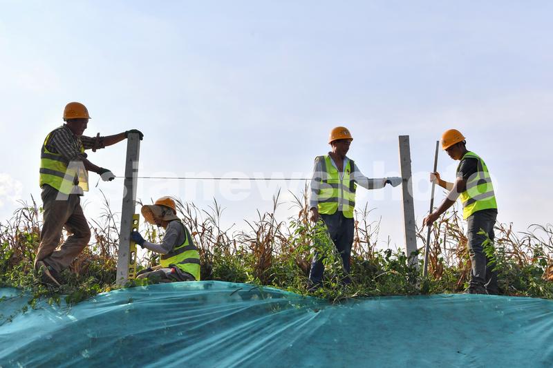 图片说明:2023年9月11日,贵州省公路集团的施工人员在六安高速公路第4标段工程建设项目现场进行隔离栅立柱安装施工作业。