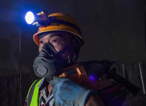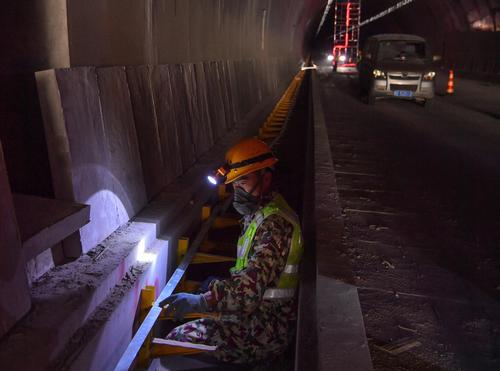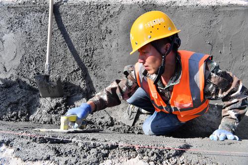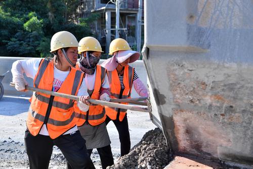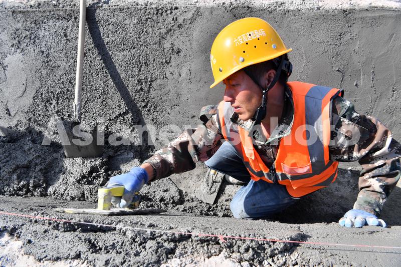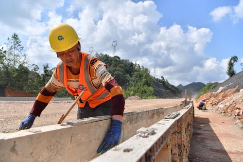 图片说明:2023年9月10日,贵州省公路集团的施工人员在六安高速公路第4标段为路沟抹水泥。
