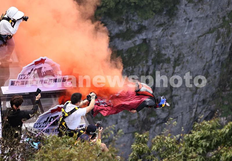 图片说明:9月15日,中国翼装飞行运动员张树鹏从天门山玉壶峰起跳台一跃而下。