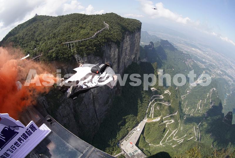 图片说明:9月15日,一名翼装飞行运动员从天门山玉壶峰顶起跳台一跃而下。