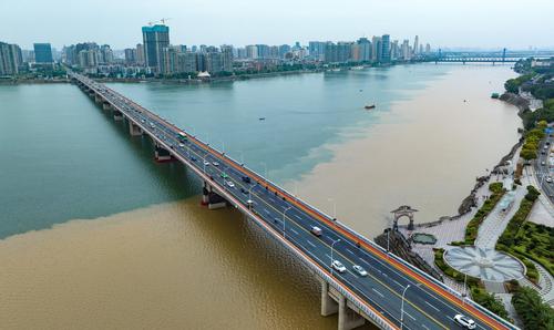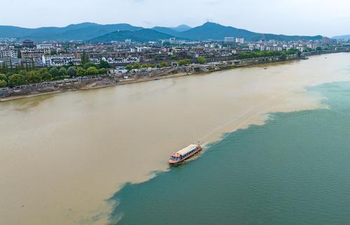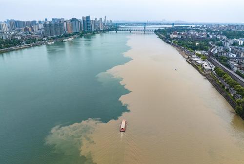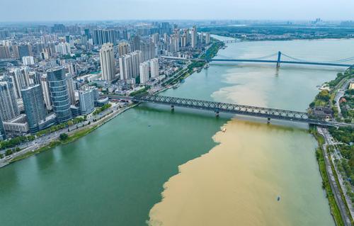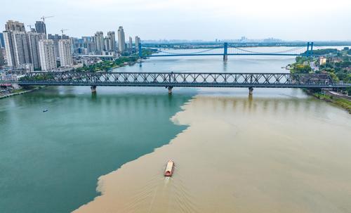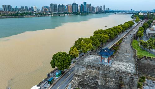 图片说明:2023年9月20日,汉江湖北襄阳城区段呈现“泾渭分明”景观。