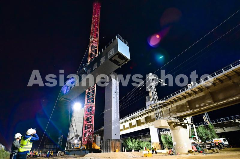 图片说明:2023年9月20日拍摄的包银高铁跨昆都仑河特大桥首榀门式墩钢盖梁吊装现场。