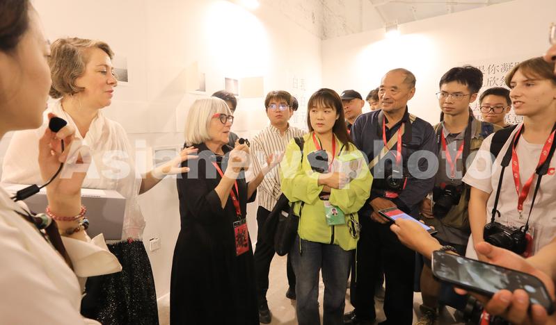 图片说明:2023年9月19日,山西平遥,中外的摄影师在探讨展示的作品。
