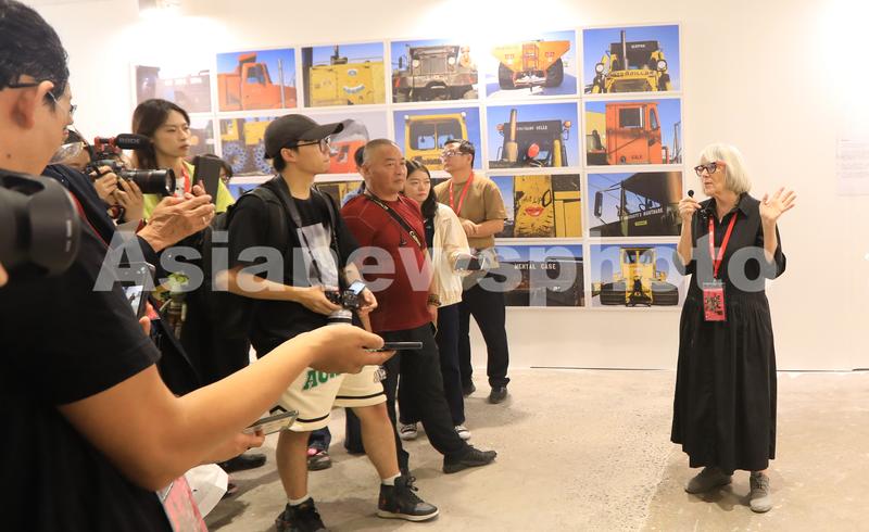 图片说明:2023年9月19日,山西平遥,国外的摄影师在介绍展出的作品。