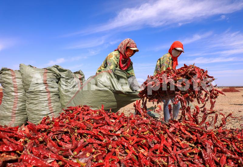 图片说明:2023年10月3日,甘肃省酒泉市金塔县辣椒晾晒场上,种植户抢抓天气晴好时机进行晾晒、装袋销售。