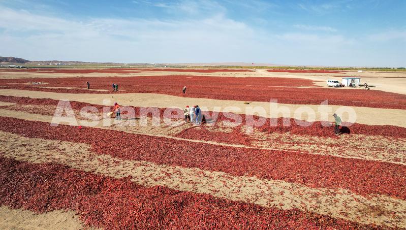 图片说明:2023年10月3日,甘肃省酒泉市金塔县辣椒晾晒场上,种植户抢抓天气晴好时机进行晾晒、装袋销售。