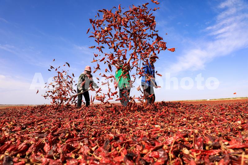 图片说明:2023年10月3日,甘肃省酒泉市金塔县辣椒晾晒场上,种植户抢抓天气晴好时机进行晾晒、装袋销售。
