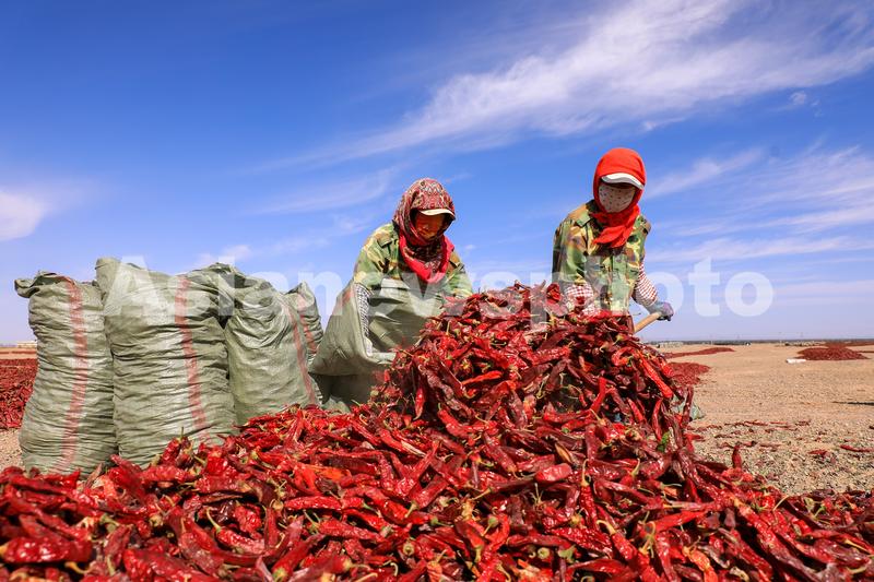 图片说明:2023年10月3日,甘肃省酒泉市金塔县辣椒晾晒场上,种植户抢抓天气晴好时机进行晾晒、装袋销售。