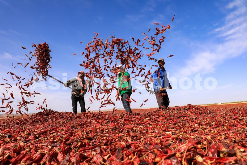 图片说明:2023年10月3日,甘肃省酒泉市金塔县辣椒晾晒场上,种植户抢抓天气晴好时机进行晾晒、装袋销售。