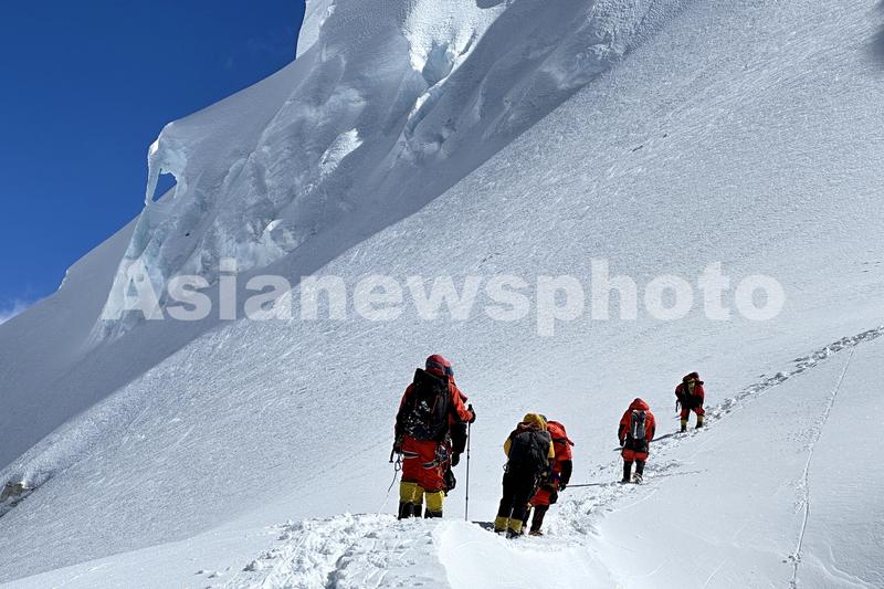 2023年10月1日,甘肃省张掖市青年马啸同他的团队一起在攀登世界第六大高峰卓奥友峰的途中。