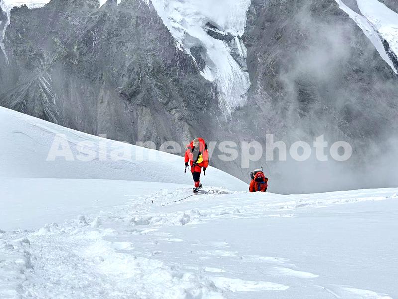 2023年10月1日,甘肃省张掖市青年马啸同他的团队一起在攀登世界第六大高峰卓奥友峰的途中。