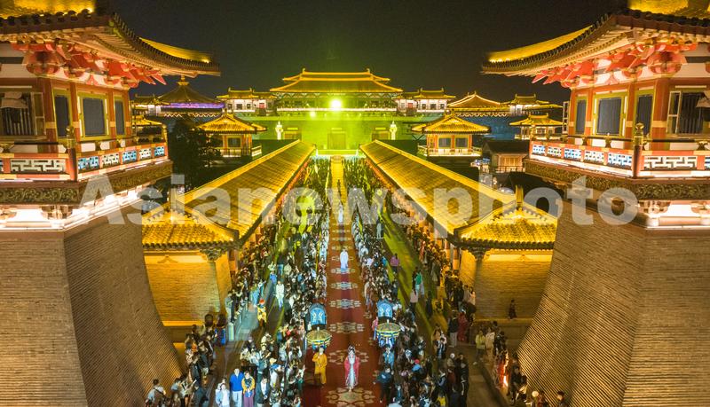 2023年10月10日,湖北省襄阳市,游客在襄阳唐城景区观看汉服巡游演出。