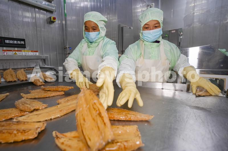 图片说明:2023年10月11日,在福建省福清市城头镇的胜田(福清)食品有限公司,工人正在对烤鳗产品进行包装。