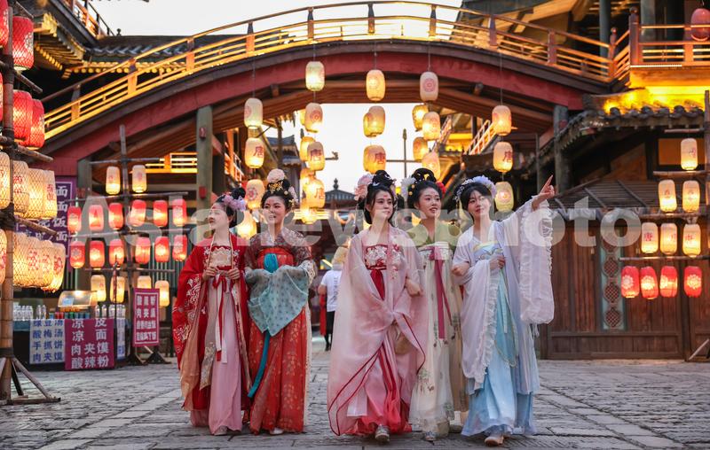 2023年10月10日,湖北省襄阳市,游客身着汉服在襄阳唐城景区游玩。