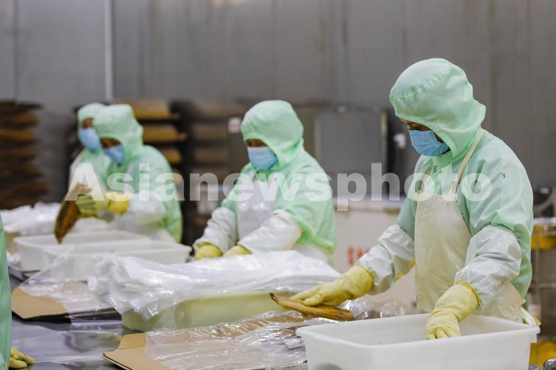 图片说明:2023年10月11日,在福建省福清市城头镇的胜田(福清)食品有限公司,工人正在对烤鳗产品进行包装。