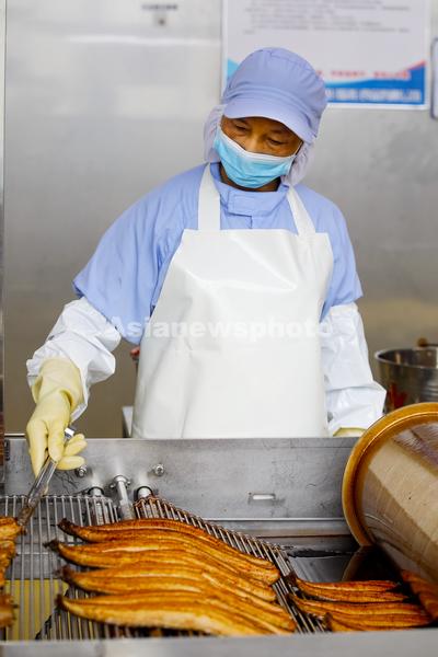图片说明:2023年10月11日,在福建省福清市城头镇的胜田(福清)食品有限公司,工人正在自动化烤鳗生产线上忙碌。