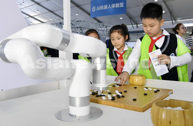 图片说明:2023年10月24日,安徽省合肥市,第六届世界声博会暨2023全球1024开发者节在位于蜀山区的合肥体育中心开幕,小朋友在和机器人对弈。